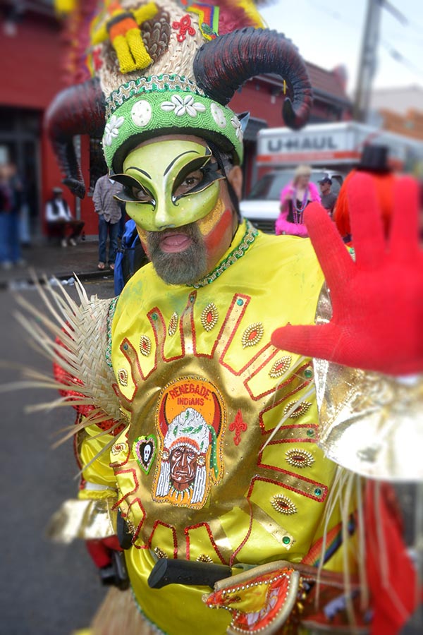 Members of the Krewe of Renegade Indians, above and below. In this city, where we have three kinds of Indians. white people can't be Indians, unless they create their own kind of Indian.